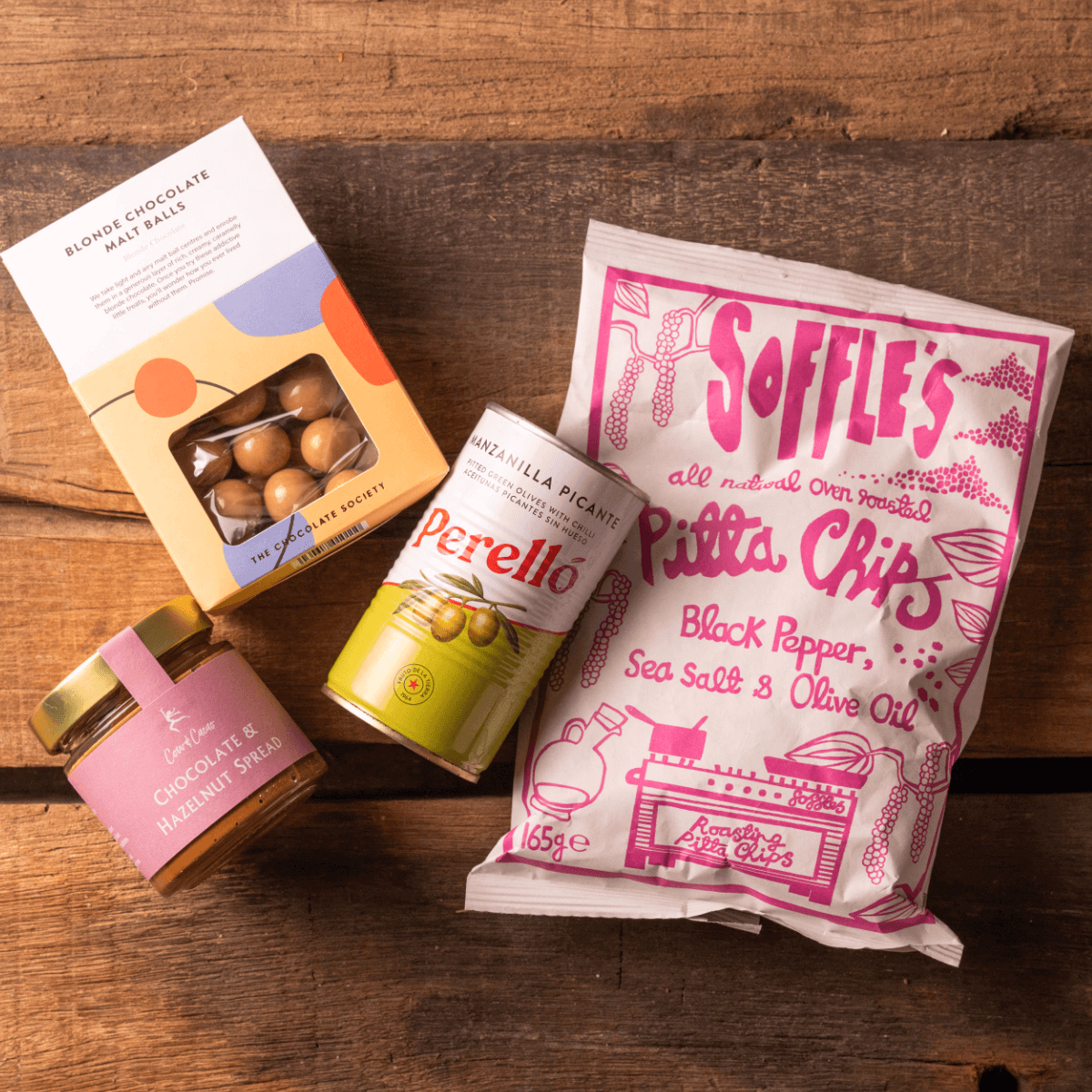 A delicious handpicked selection of treats for a loved one. From our Cow & Cacao Chocolate & Hazelnut Spread made on the farm by our Chocolatiers to perfectly crisp Black Pepper, Sea Salt & Olive Oil Soffles pitta crisps!