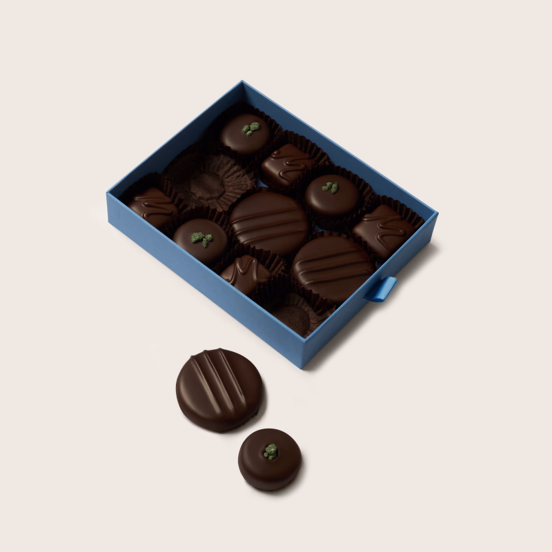 A fresh take on tradition, this Queen-sized box offers a refined trio of handcrafted mint chocolates: smooth mint creams, bold 75% Vienna mints, and buttery mint caramels. Each piece is made with care using the finest ingredients, delivering a perfect balance of cool peppermint and rich Valrhona chocolate. A beautifully presented collection for after-dinner elegance or those who simply love mint chocolates done properly.