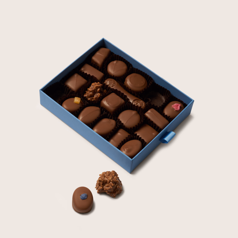 A beautifully curated box showcasing only milk-chocolate delights from Audrey's full range. Each piece is handcrafted in-house, featuring a rich variety of fondant creams, luscious caramels, smooth praline, crunchy nuts, and delicate ginger - all enrobed in creamy Valrhona 38% milk chocolate. This selection celebrates the smooth, comforting sweetness of milk chocolate in every bite, making it a timeless choice for gifting or indulgent moments.