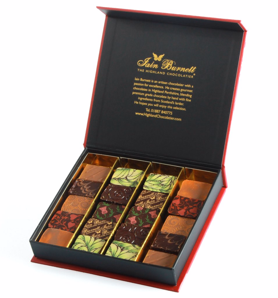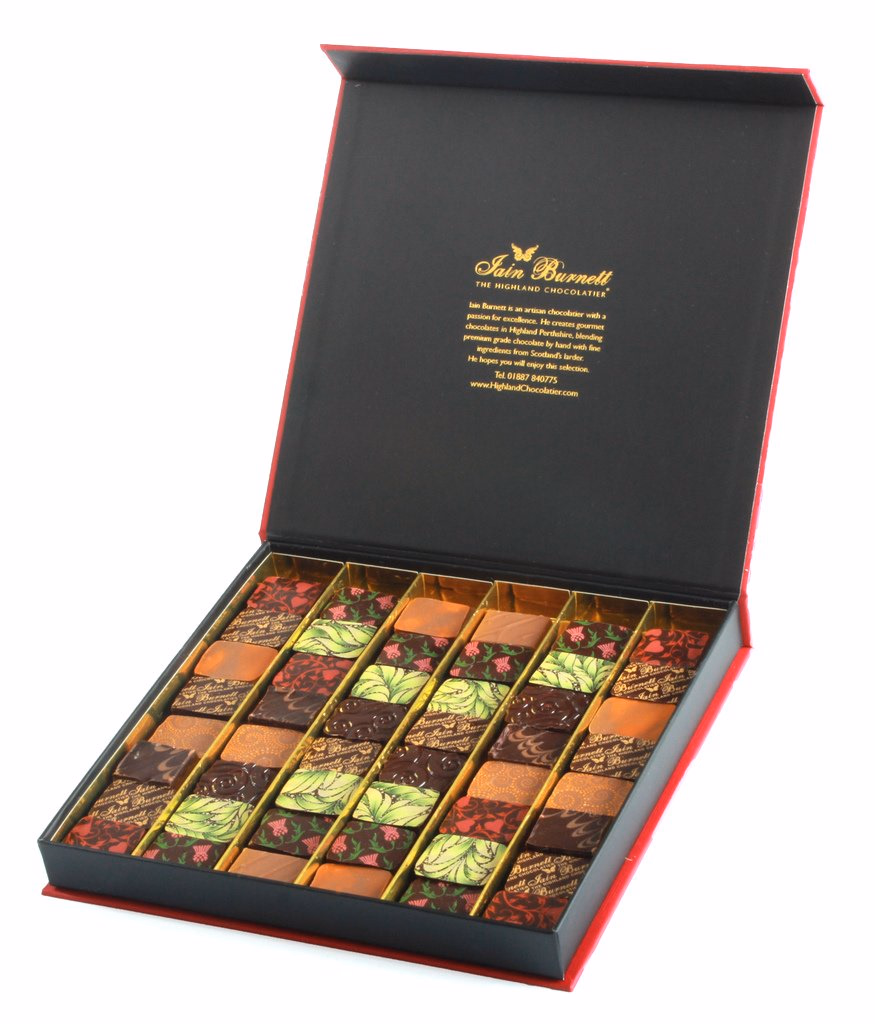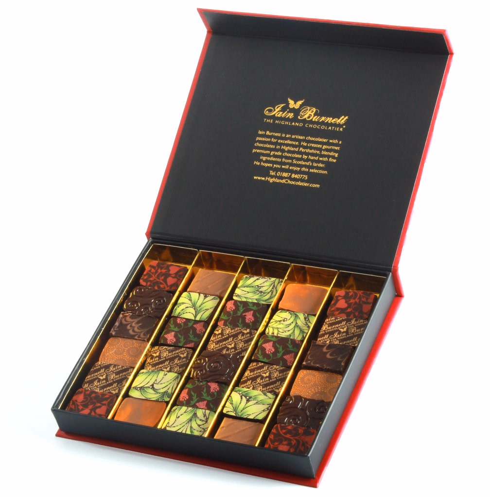 A delicious celebration of Scotland and Robert Burns, perfect for Burns Night and year-round gifts! Inspired by Scotland in all its drama, history and romance - its wild coasts, pure earth, glowing hearths, and gardens both wild and tamed. The Spirit of Scotland Selection draws together colour, flavour and the verses of the beloved poet Robert Burns. Curated to evoke the vibrant colours of the Burns Heritage tartan, each chocolate has been chosen to reflect a different corner of the Scottish landscape, telling a story as rich and transportive as the words of Rabbie himself: