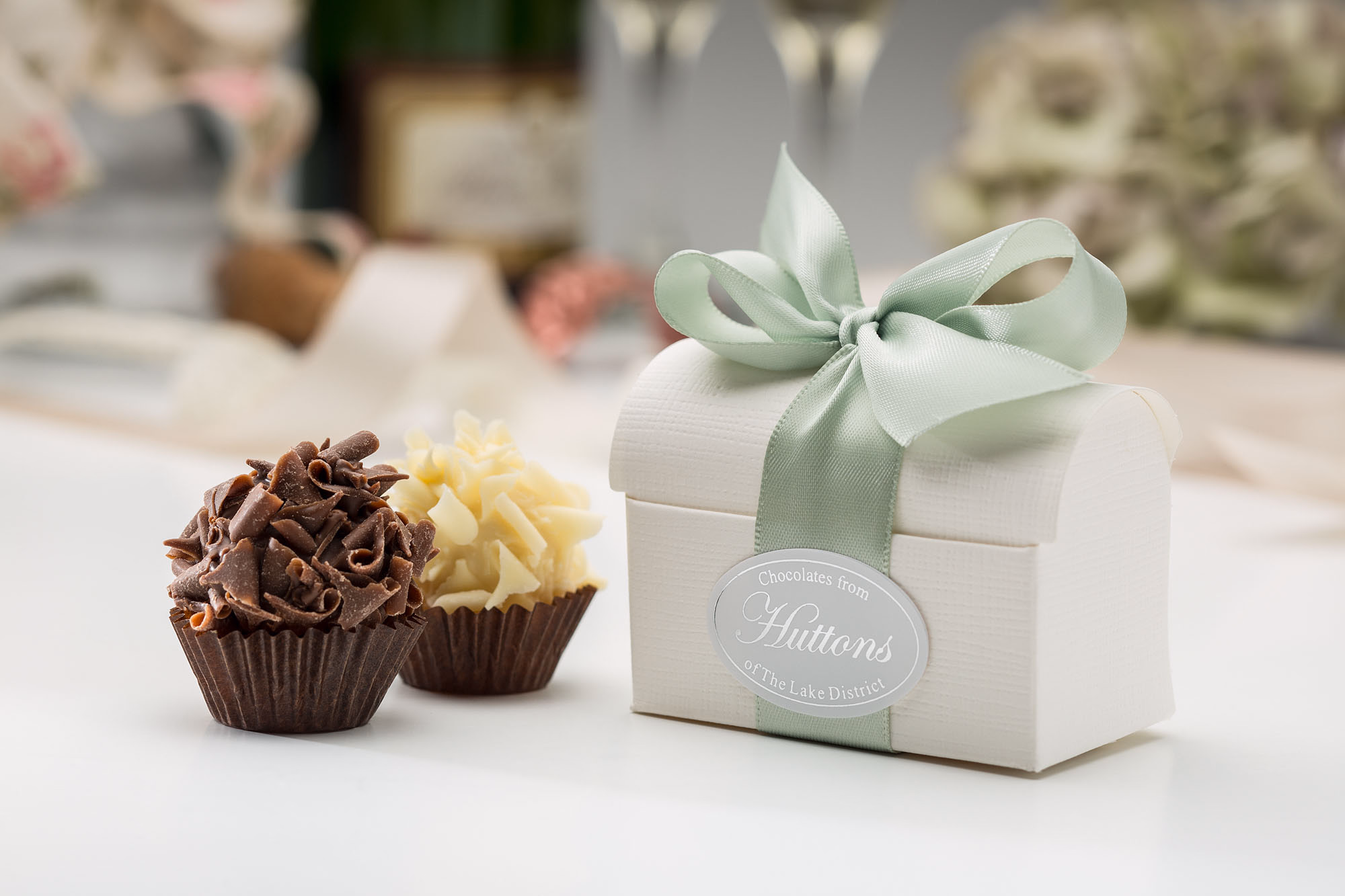 Beautiful soft white chest box with a satin ribbon containing a Huttons Exclusive Milk chocolate truffle and a White Champagne truffle.