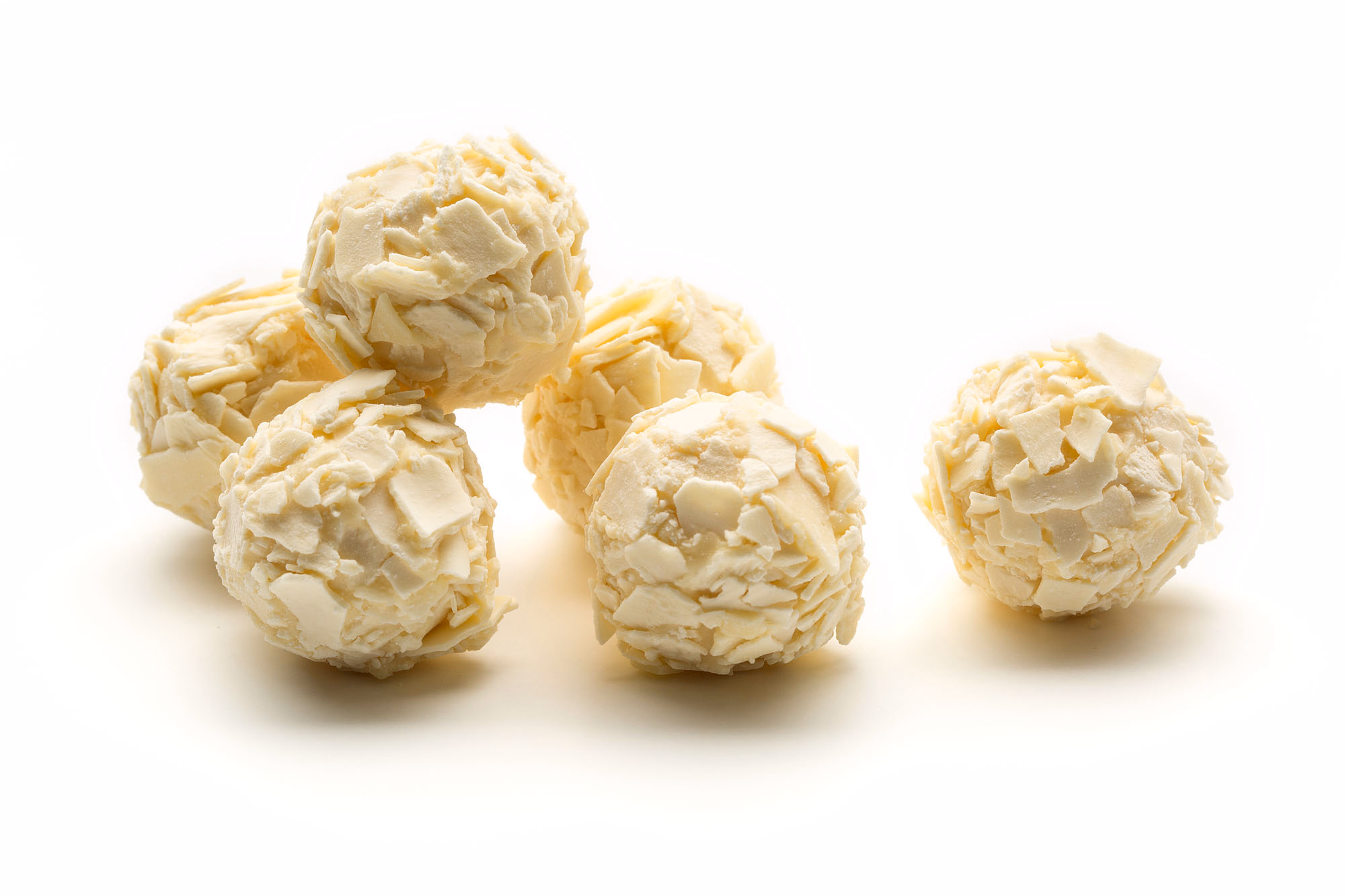 Huttons Exclusive White Chocolate Truffles, light creamy ganache hand dipped in white chocolate and rolled in white chocolate flakes