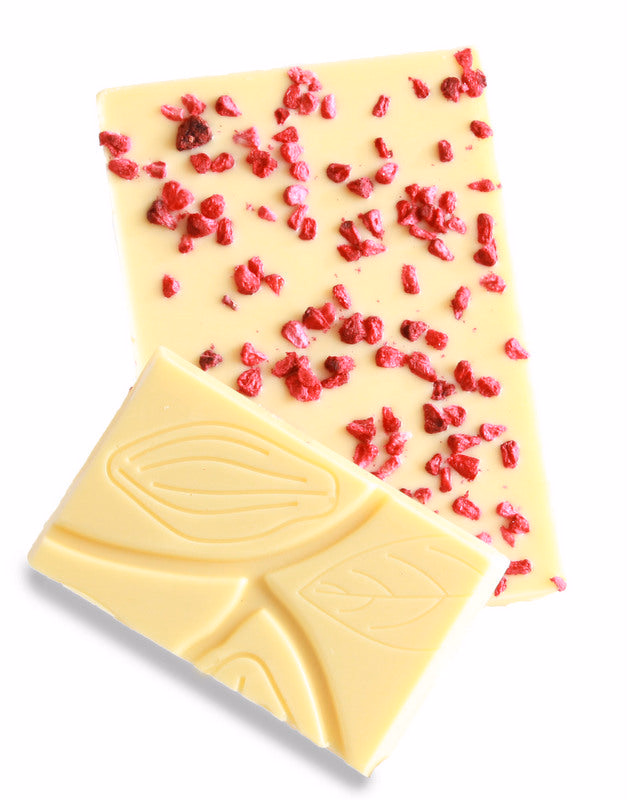 An artisan bar of creamy white couverture chocolate scattered with gently dried and crushed natural raspberries. Iain uses pure "blonde" white chocolate which contains a high percentage of superior quality cocoa butter so less sugar is needed. This gives it an exceptionally creamy flavour and texture, without being sickly sweet.